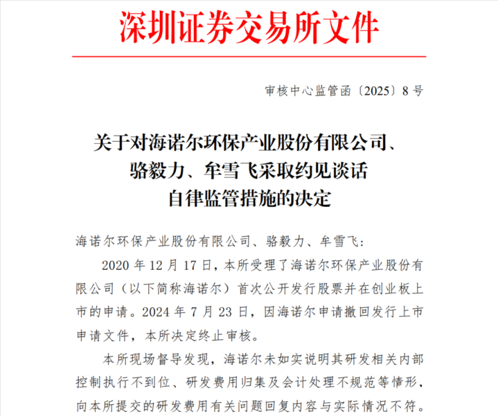 就这样,过会近3年后,海诺尔的IPO申报仍卡在审核注册阶段,最终在2024年7月23日,因海诺尔申请撤回发行上市申请文件,深交所决定终止审核。而就在此次主动撤回IPO申报材料的9个月后,海诺尔再次收到来自深交所的自律监管措施。