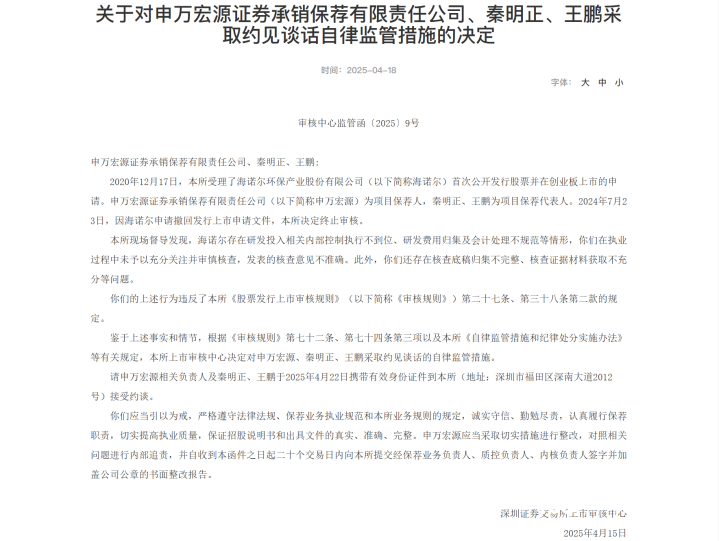 同时,申万宏源证券承销保荐在执业过程中未予以充分关注并审慎核查,发表的核查意见不准确。此外,还存在核查底稿归集不完整、核查证据材料获取不充分等问题。深交所决定对申万宏源、秦明正、王鹏采取约见谈话的自律监管措施。